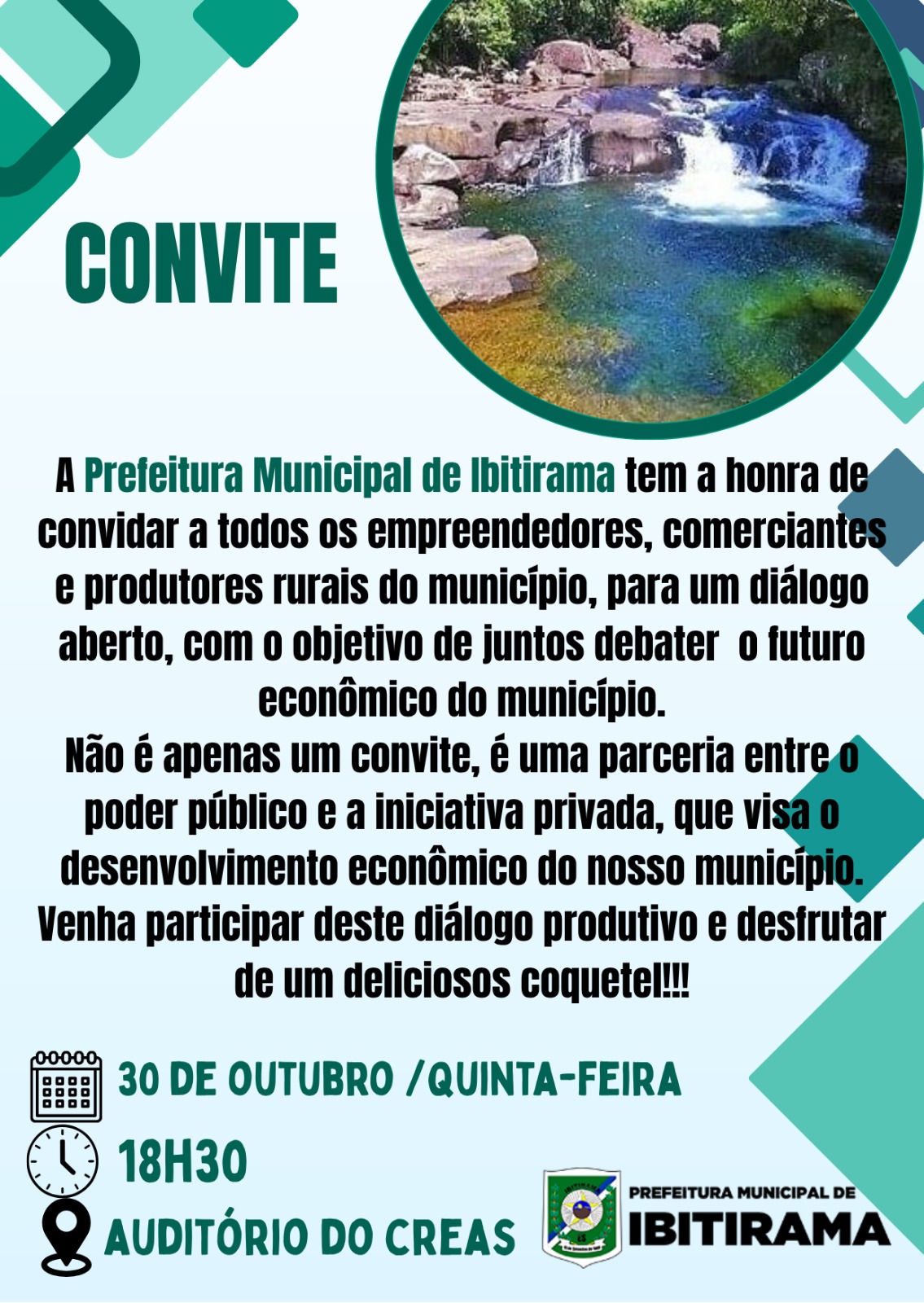 | Mensal | 31/10/2025 | 2025 | Outubro | Audiência no CREAS sobre o desenvolvimento econômico do município de Ibitirama-ES em parceria com a iniciativa privada. | conviteparceriapoderpublicoiniciativaprivada.jpeg | 389.83 KB |